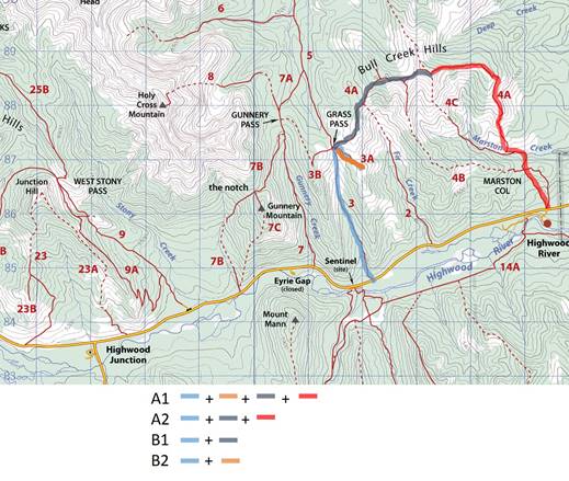 A1 side trip: Take first trail to the right to go southeast on to Fir Creek Point and out to the Boundary Pine (about 2 km round trip). Back track to the star-like junction and continue eastward about 3 km along the ridge above Fir Creek Valley. |